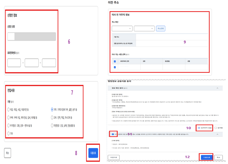 - 필요 정보 입력 이때 필요한 정보 이전 주소 새로운 주소 가족 구성원 정보를 정확히 입력합니다